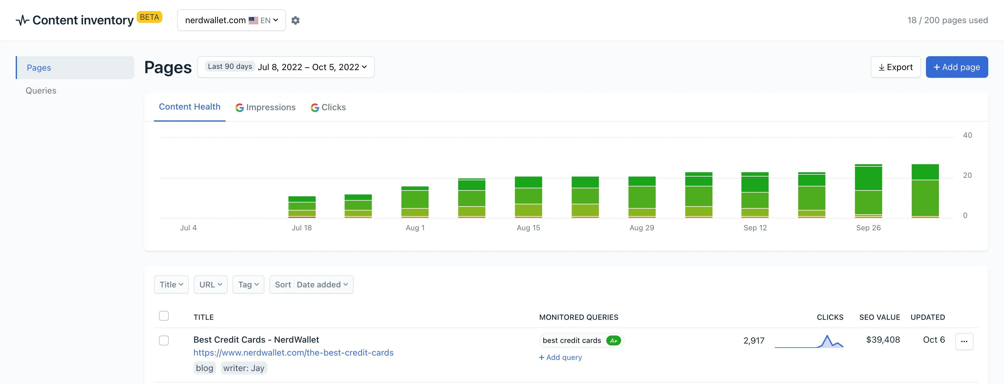 Clearscope’s optimization tool features a content inventory that automatically monitors your published pieces and notifies you of changes in content health, Page 1 visibility, or user intent.