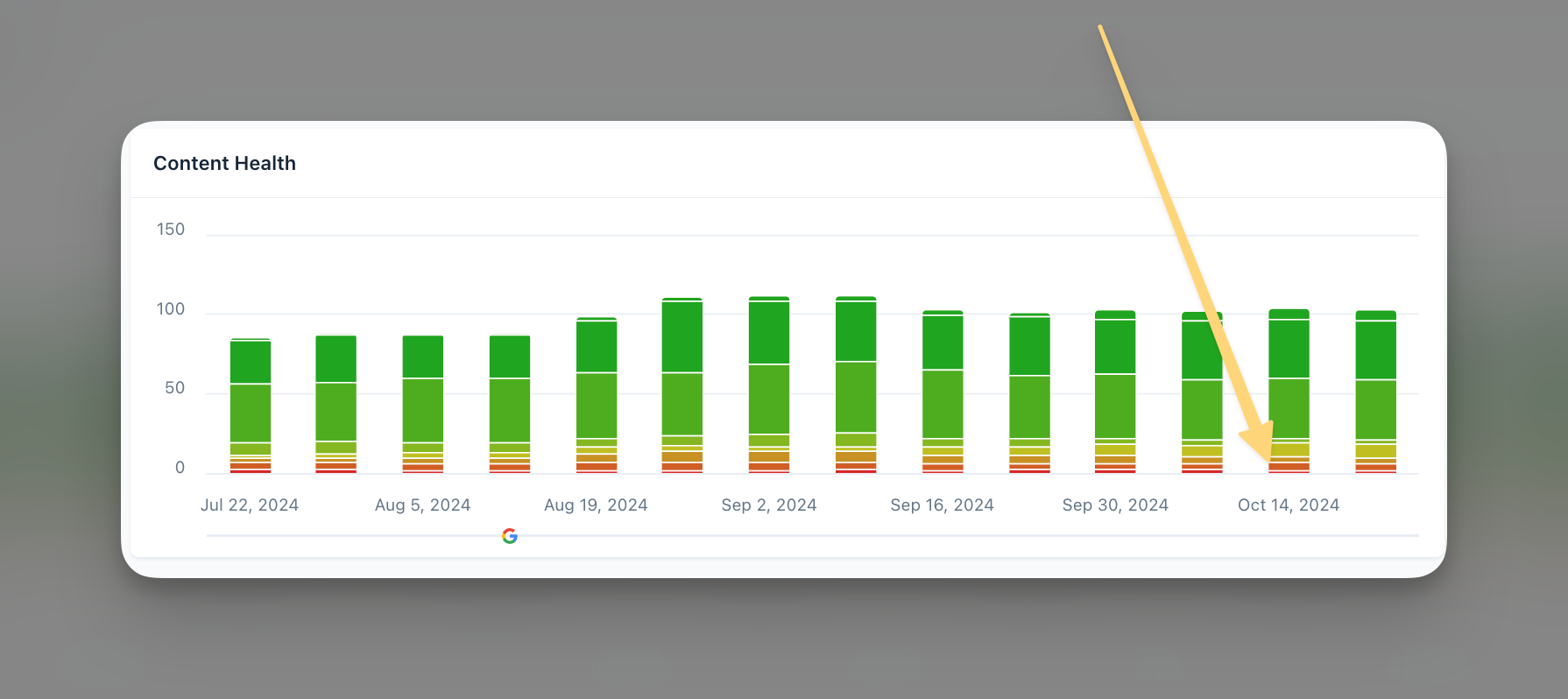 Easily see your content's overall health so you can spot which pages need attention ASAP. Use Content Health indicators in your Clearscope Inventory Analytics as a guide. Yellow, orange, and red indicate pages that likely need a refresh.