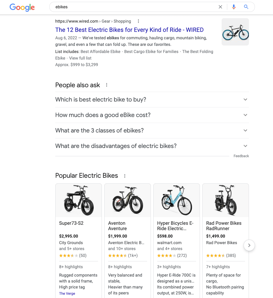 You can start by searching the term and looking at the top results. For “ebikes,” you can see that the user intent revolves around finding an ebike to purchase.