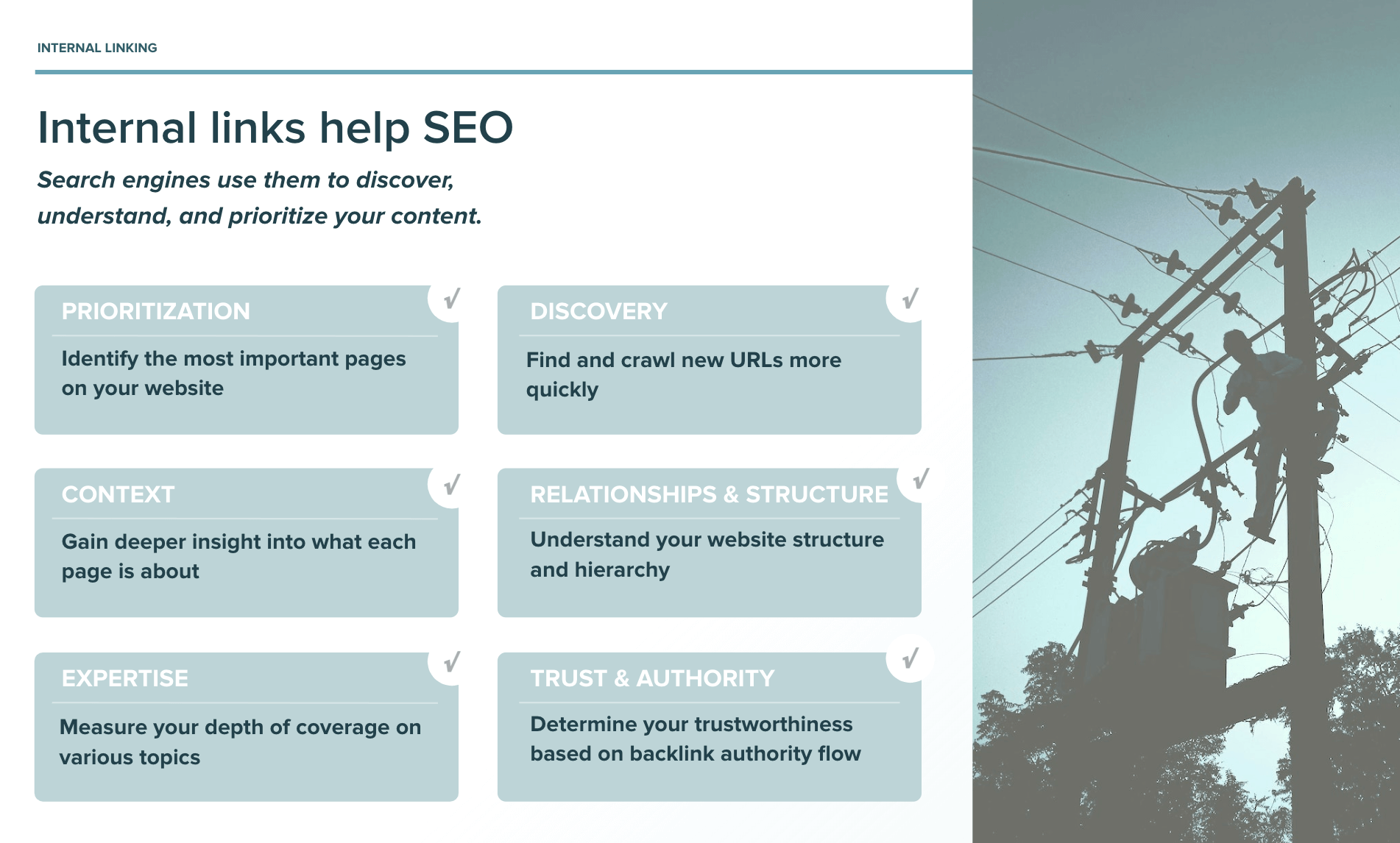 Internal links help SEO with prioritization, discovery, context, relationships & structure, expertise, trust & authority.