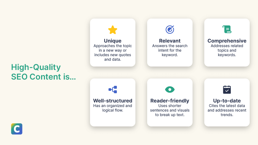 High-quality SEO content is unique, relevant, comprehensive, well-structured, reader-friendly, and up-to-date.