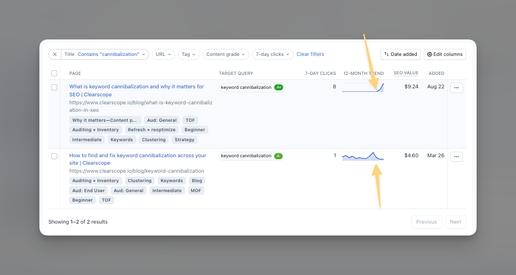 In Clearscope, you can use the 12-month trend graph to easily spot pages in a topic cluster that might be cannibalizing each other's traffic.