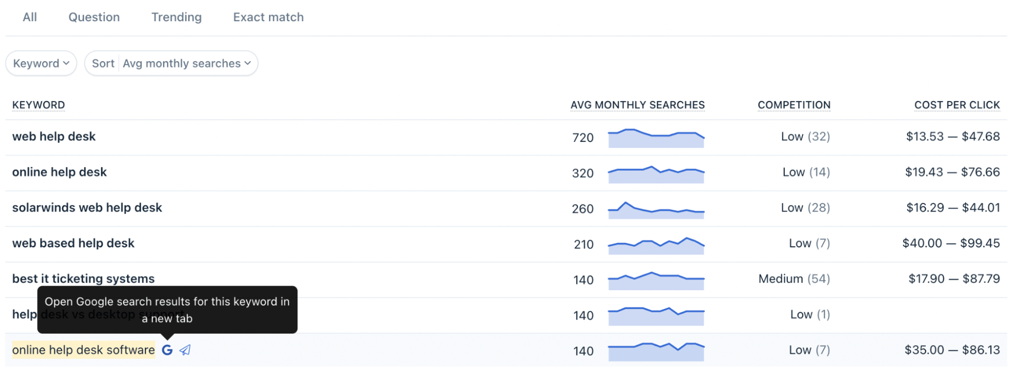 Then, you can easily dig into each keyword by opening the search engine results page (SERP) to see what’s already ranking.