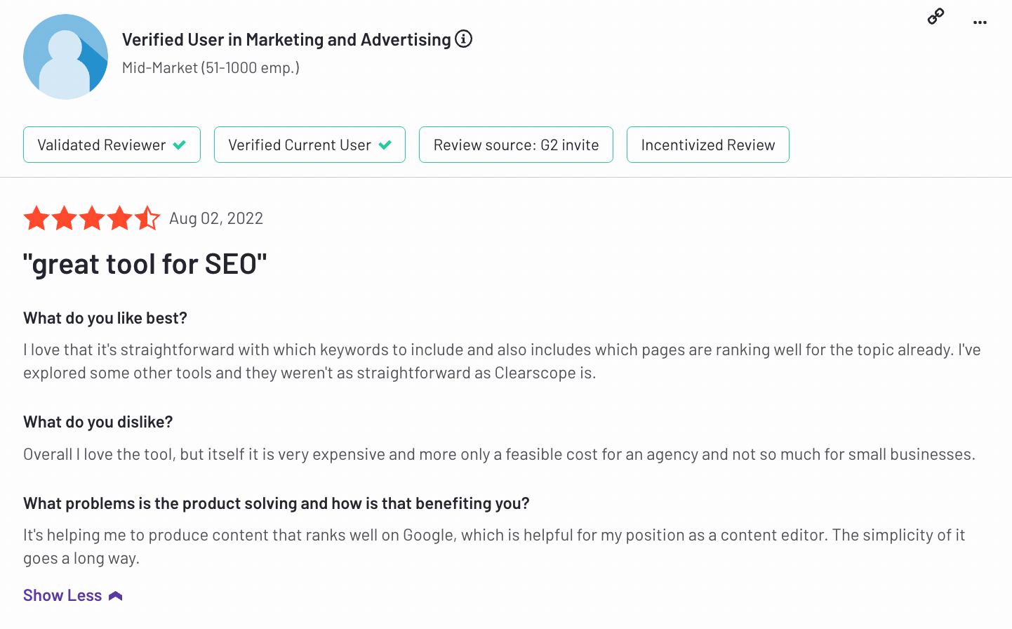 That said, we notice similar gripes with Frase’s Content Reports as seen with MM. Reviewers say that reports have such a high number of suggested terms (300+) but don’t provide insights about the recommendations, so it’s hard to know what to prioritize. Then, there are often redundancies throughout term recommendations, so you have to include multiple variations of terms and phrases, which can clunk up your writing and make it sound unnatural.