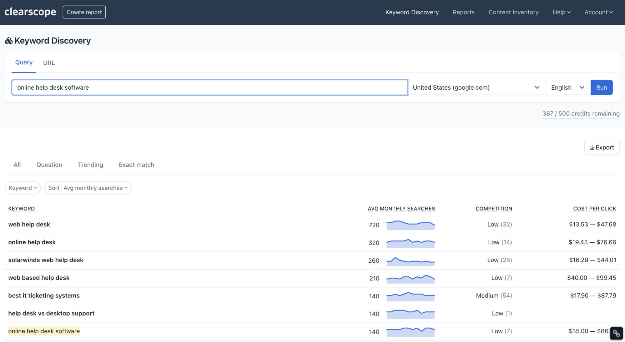 Type any word or phrase — for example, say you’re interested in researching keywords to promote online help desk software: