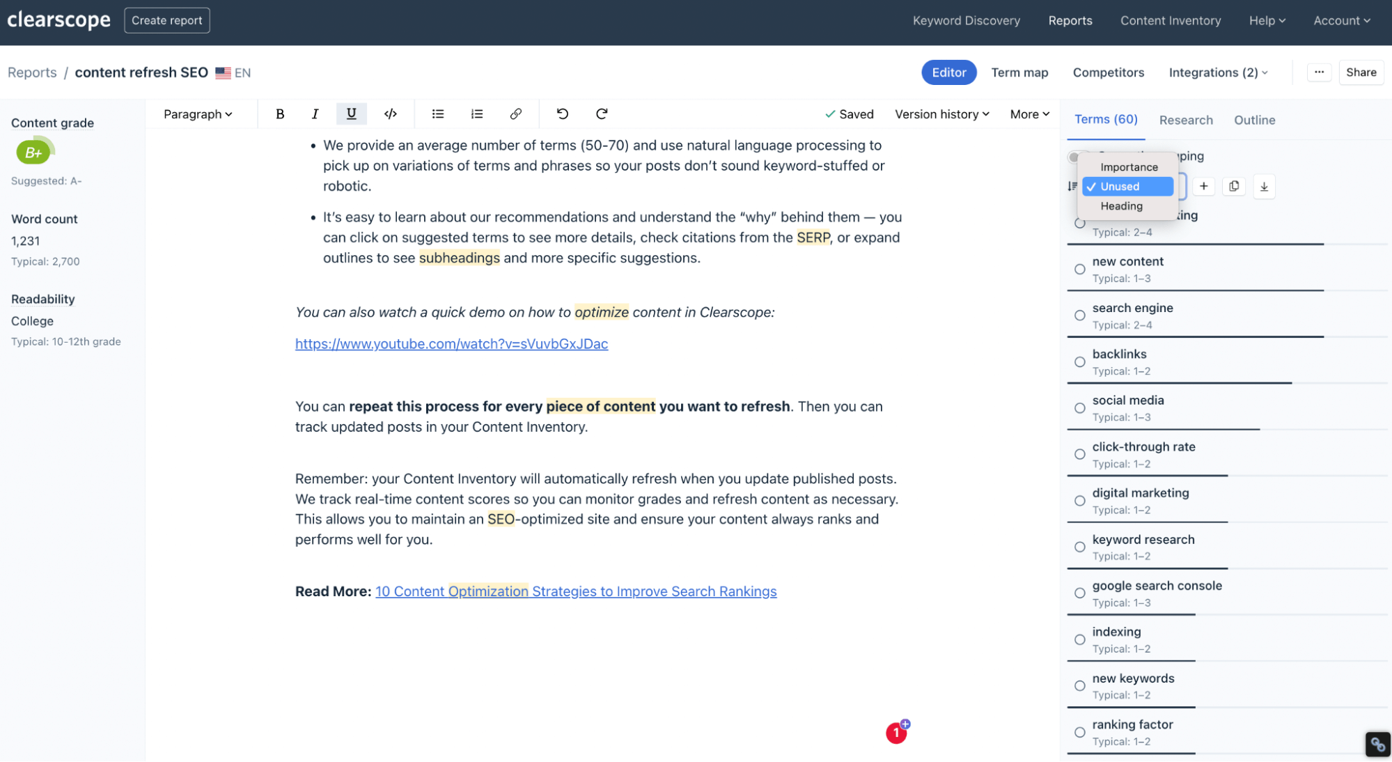 As you write, you can filter to see “unused terms” and work your way up to the recommended content grade. We also show you the suggested word count and readability level to help you check all of the important boxes.