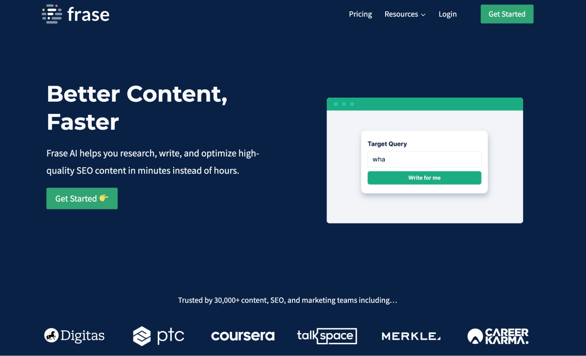 Frase is a solution that may appeal to content marketers that write and publish (otherwise manage) a high volume of website content because it has AI-powered features to speed up the writing process. Their SEO solution provides suggested templates to get you started and even has a “Write for Me” feature that can autocomplete both sentences and whole sections of copy, such as introductions, product descriptions, and FAQs. This allows you and your writing team to quickly check topics off your content plan and keep up with a demanding publishing schedule.