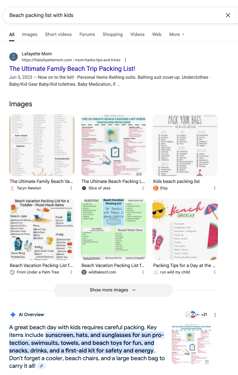One is broad and general, surfacing mostly generic listicles or travel blogs offering basic packing tips like sunscreen, swimsuits, and flip-flops. The other is highly specific—the SERP includes parenting sites, toddler-focused checklists, and product recommendations for items like swim diapers, shaded beach tents, and snack containers. It likely requires tailored advice, age-specific gear suggestions, and parent-friendly tips to truly satisfy the query.