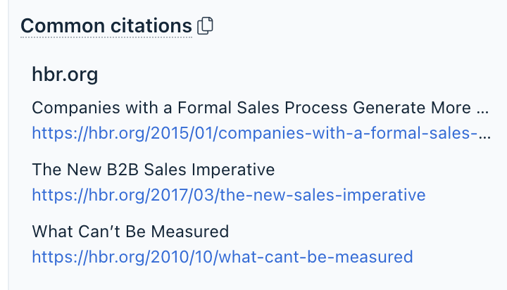 With Clearscope, you can easily find relevant sources for your target keyword by going to Common Citations on the Research tab. Here you’ll see frequently used links grouped by the source domain.