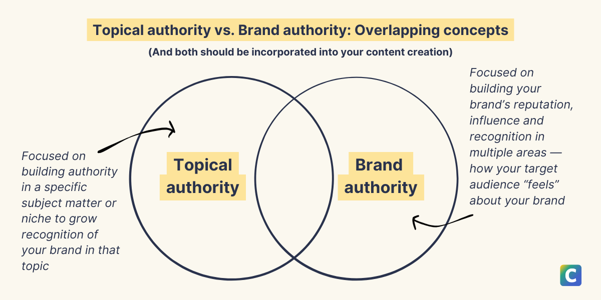 In short, topical authority is focused on a subject matter or niche, while brand authority is broader, relating to the brand's reputation and influence across multiple areas.